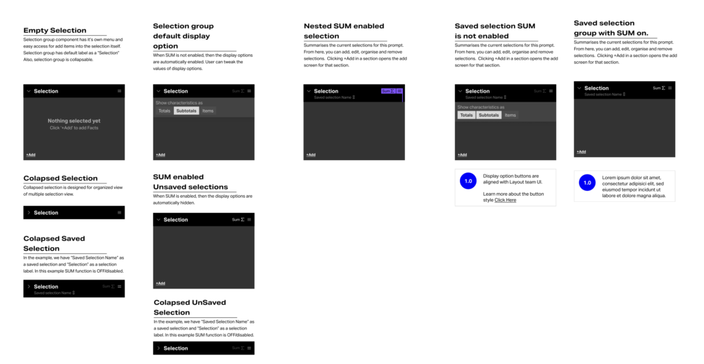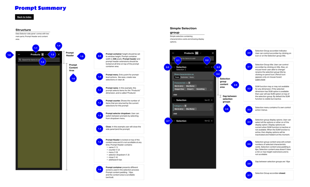 Designed a contextual side panel system with progressive disclosure, allowing users to start with common selections and drill down into advanced options as needed. Created a component library including selection groups, characteristic cards, folder navigation, condition builders, and validation patterns. The 84-page design specification documented every interaction state, edge case, and responsive behavior.