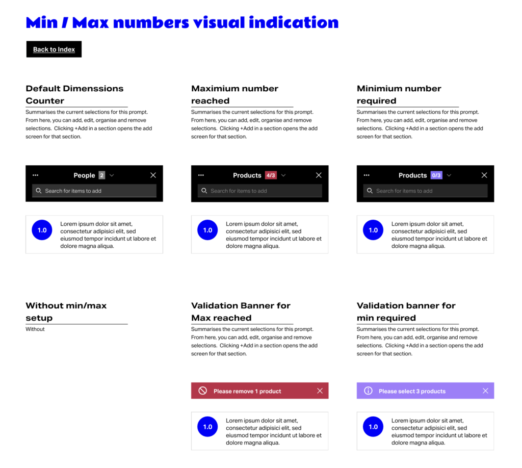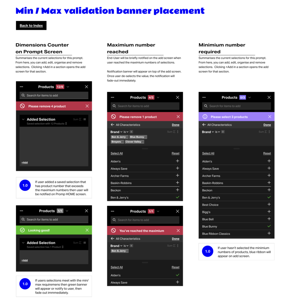 Implemented validation banners for min/max constraints, real-time item counters, and clear visual states for valid/invalid selections.